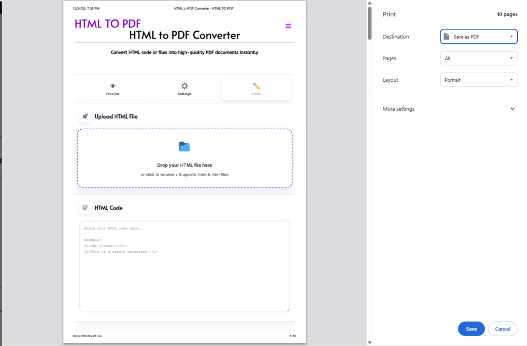 For more professional results—especially for local HTML files, complex layouts, or when you need custom settings—a dedicated online tool is far superior. We recommend using HTML To PDF Converter at htmltopdf.live. It works in Chrome but offers far more power and reliability than Chrome’s native printing.