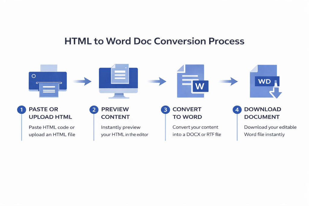 Converting HTML into a Word document is quick and effortless with our online tool. There’s no need to waste time manually rewriting content or copying code into Word files. Simply paste your HTML code or upload an HTML file, preview it instantly, and generate an editable Word document in seconds. Our HTML to Word converter works entirely in your browser, delivering fast and accurate results with preserved structure and formatting — all in just a single click.