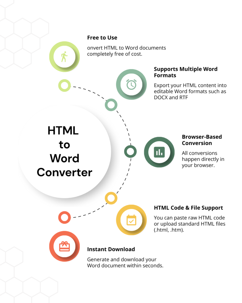 This HTML to Word converter preserves your document structure, including headings, paragraphs, lists, tables, and basic styling, ensuring that the final Word file closely matches your HTML preview. It works smoothly across different HTML structures, making it ideal for developers, designers, students, educators, and professionals who need editable documents.